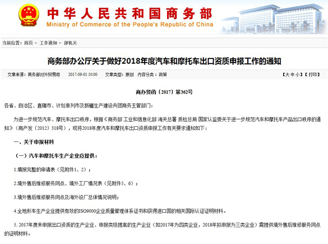 為進(jìn)一步規(guī)范汽車、摩托車出口秩序,根據(jù)《商務(wù)部 工業(yè)和信息化部 海關(guān)總署 質(zhì)檢總局 國(guó)家認(rèn)監(jiān)委關(guān)于進(jìn)一步規(guī)范汽車和摩托車產(chǎn)品出口秩序的通知》(商產(chǎn)發(fā)〔2012〕318號(hào)),現(xiàn)將2018年度汽車和摩托車出口資質(zhì)申報(bào)工作有關(guān)要求通知如下: