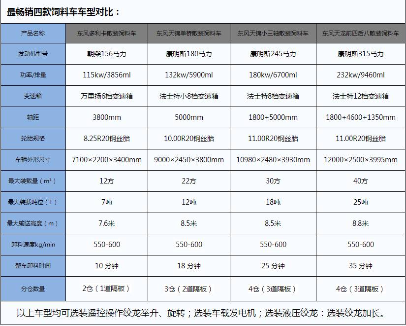 | 其它資料:采用東風(fēng)原裝底盤,康明斯180/210馬力,法士特小8擋變速箱,5000mm軸距,10.00R20鋼絲胎,電動門窗,中控鎖,ABS,方向助力,空調(diào),環(huán)保+燃油,罐體材質(zhì)采用4mm優(yōu)質(zhì)碳鋼板,整車3條絞龍,由3個5.5KW電機帶動,頂部絞龍用液壓控制舉升,可左右旋轉(zhuǎn)180°,罐體可做叁個獨立分倉,可以獨立控制各分倉卸料順序和速度,卸料管傾斜60度,垂直卸料高度8.5米, 大裝載12噸,整車卸料完用時約18分鐘。 |