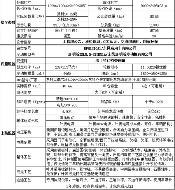 溫馨提示:生產(chǎn)周期為20個(gè)工作日 購(gòu)車(chē)服務(wù)咨詢電話:13277608333 上裝配置: 箱體容積40立方米,分四倉(cāng),可同時(shí)裝不同飼料,箱體尺寸:9000*2495*2310mm,電動(dòng)絞龍采用西門(mén)子電機(jī)、德力西電器/液壓絞龍采用美國(guó)進(jìn)口雙聯(lián)液壓泵、液壓馬達(dá)、液壓控制閥。卸料速度為電動(dòng)600kg/min/液壓1000kg/min,卸料高度≥8m(標(biāo)配8米,可定制),殘留率≤0.022%,專用抗腐蝕油漆,一道噴砂,二道打磨,三道油漆。