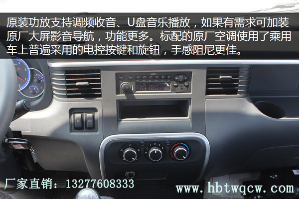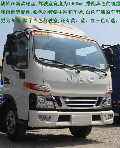 江淮駿鈴V5底盤型號HFC1045P92K2C2ZV,1900mm豪華寬體駕駛室,軸距3308mm,江淮五十鈴HFC4DA1-2D發(fā)動機120馬力,7.00R16LT 8PR鋼絲胎,ABS,電動門窗,中控鎖,原廠空調,多功能方向盤,LED大燈。